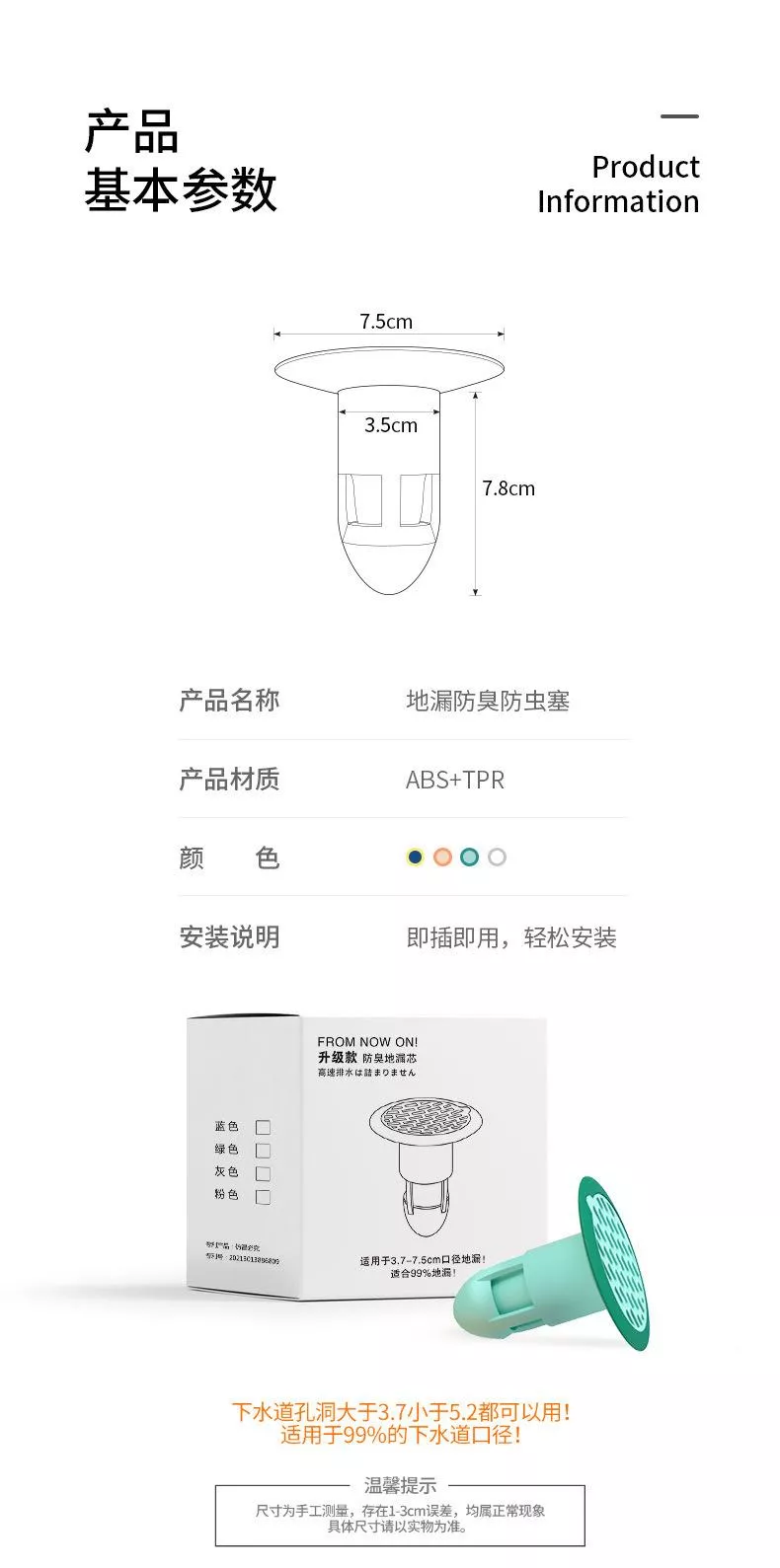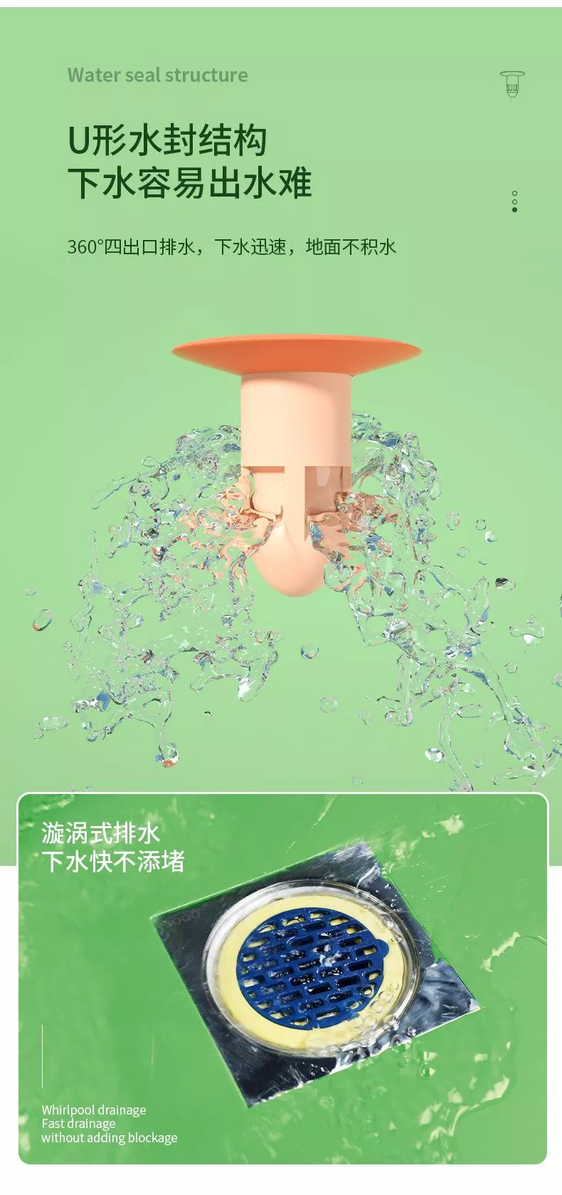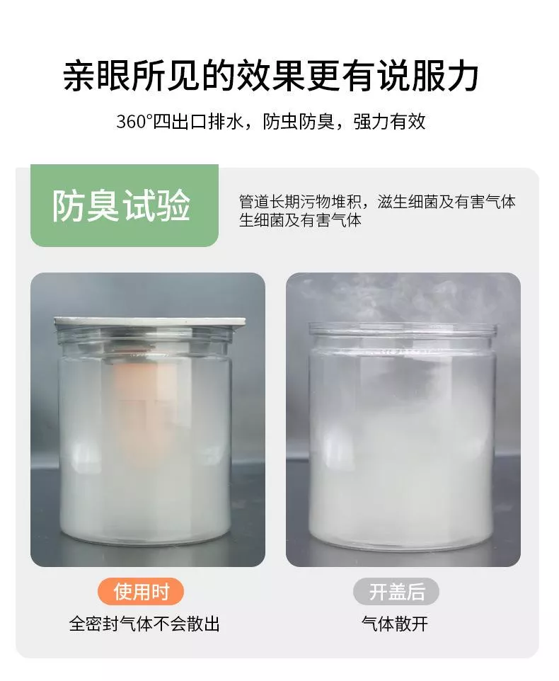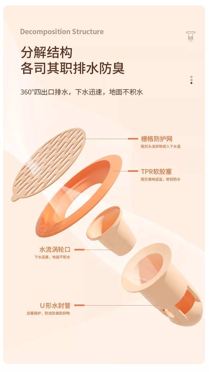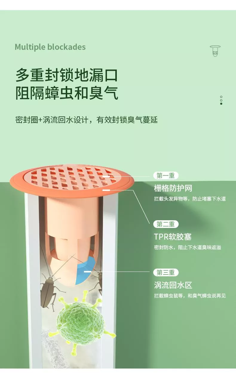 🛡️ 三重防護:🕸️栅格防護網+🧽TPR軟膠密封圈+💧U 形水封/🔄渦流回水區,封住異味🤢、攔住小強🪳。