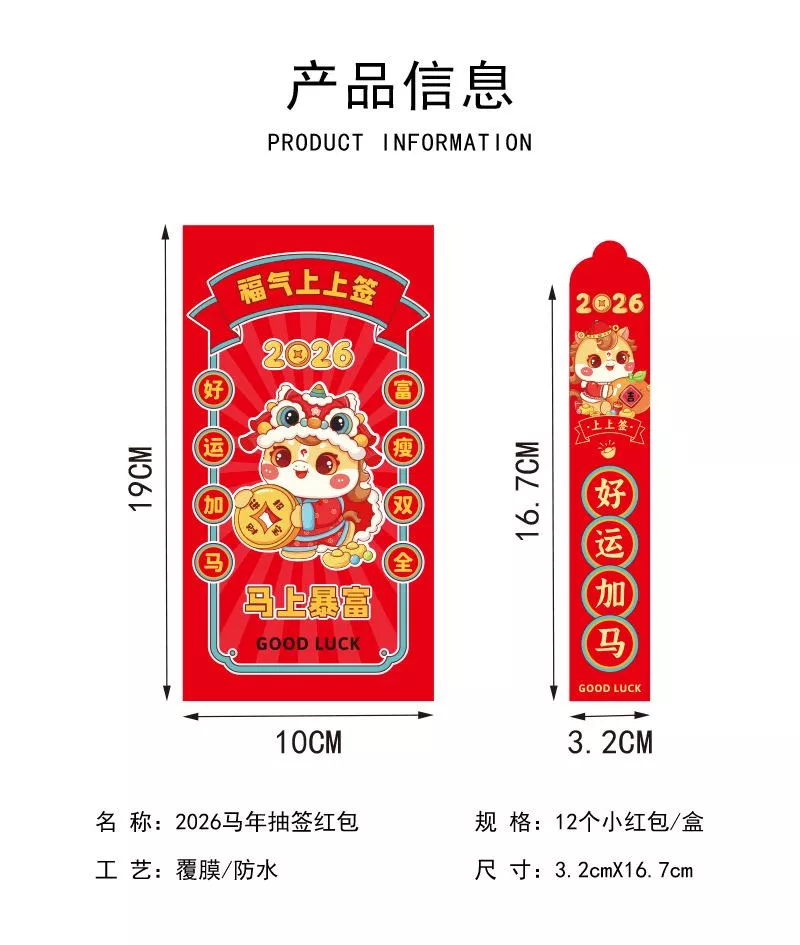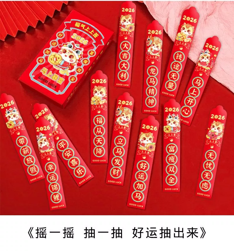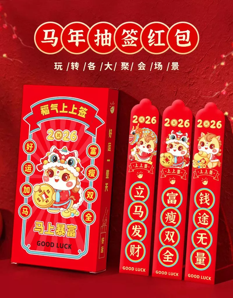 豐富吉祥寓意: 每盒內含 12 支不同祝福主題的幸運籤紅包,如「立馬發財」、「錢途無量」等 ,傳遞多樣化的馬年好運!💫 讓好運**「加馬」**!